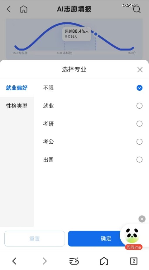 QQ浏览器也选择整合其他产品资源提升志愿推荐能力。QQ浏览器在AI志愿填报界面的右下角添加了一个“问问ima”的入口,点击后会跳转到腾讯的AI智能工作台ima上,通过该APP提供AI咨询服务。不过这需要用户先下载ima APP。