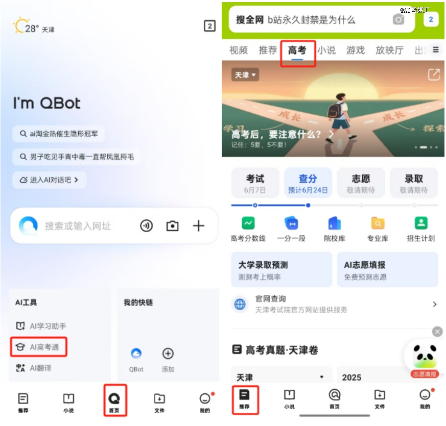 QQ浏览器是通过智能体AI高考通为用户相关的服务,主要入口有两个。一个入口在首页的左下角,直接点击AI高考通即可进入。另一个入口在推荐页的高考专栏里。如果是通过*入口,考生和家长也可以先通过与AI对话获得推荐院校。