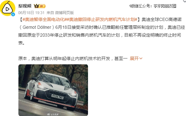 6月18日,奥迪全球CEO高德诺在接受采访时表示已推翻前任管理层所制定的计划,奥迪已经撤回原定于2033年停止研发和销售内燃机汽车的计划,目前不再设定明确的终止时间表。