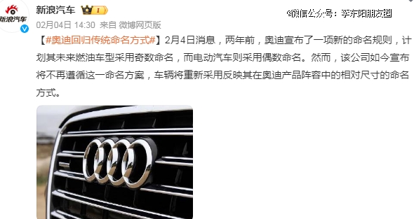 还记得今年初,奥迪宣布放弃此前以奇偶数区分电动车与燃油车的命名规则,该举动是为了纠正之前的命名在全球范围内产生了认知混乱、用户抵触的负面影响。