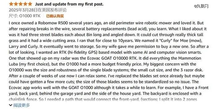 一位美国消费者查尔斯,此前已经使用Robomow R500割草机将近10年,其三片8英寸钢制刀片能高效切割浓密高草,但维护成本高(围栏维修/电池更换)。在寻找替代品时,他选择了科沃斯的Ecovac GOAT O1000 RTK,主要因这款割草机可以RTK高精度定位,并且具有AI路径规划,最关键的是,性价比非常高。