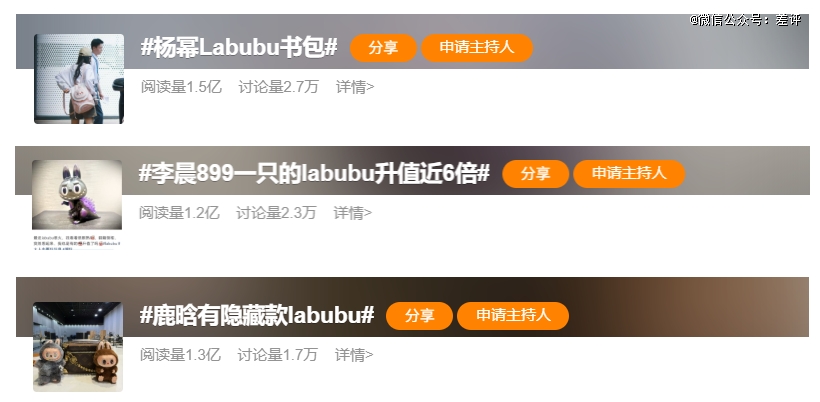 这个毛绒玩具成了明星的曝光工具,任意明星 + Labubu 的词条,基本都是上万讨论量,上亿阅读量。