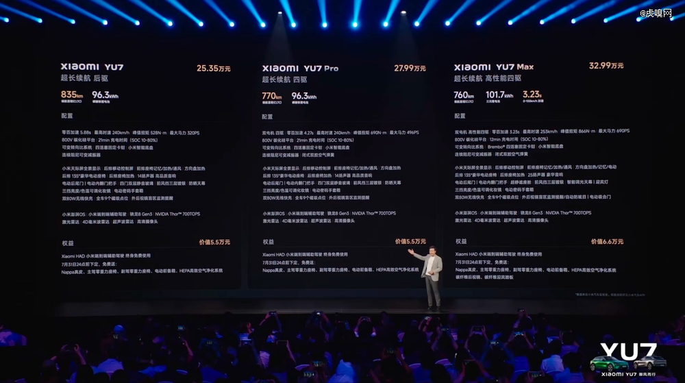 然后是前期被所有人讨论的价格,严格来说最终结果并没有惊喜。在YU7预发布阶段,其核心信息已近乎透明,业内普遍为其圈定了25万元至33万元这一“中规中矩”的预期价格带——低于是惊喜,高于则被认为偏高。最终,小米的官方定价精准地踩在了这条“中规中矩”的线上,并未展现出如SU7时期那般“卷”到*的定价策略。
