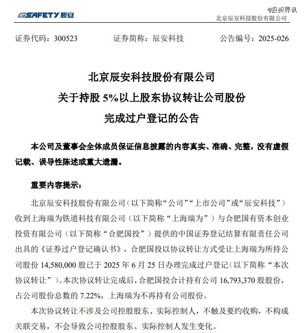 投资界(ID:pedaily2012)消息,6月25日,合肥市建投集团旗下合肥国有资本创业投资有限公司(以下简称“合肥国投”)受让上海瑞为铁道科技有限公司所持北京辰安科技股份有限公司(以下简称“辰安科技”)14,580,000股股份事项,顺利通过深圳证券交易所股权变更登记。本次协议转让后,合肥国投合计持有辰安科技16,793,370股股份,持股比例提升至7.22%,成为其第四大股东。