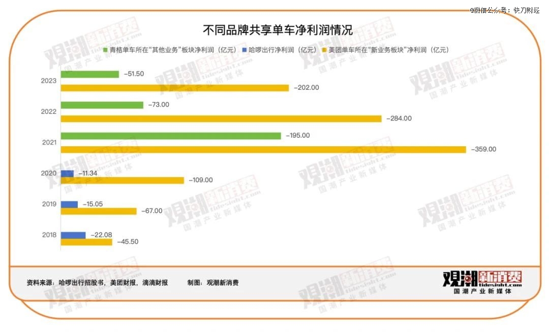 青桔和美团也没有好到哪去,据财报显示,美团2022年与2023年内共享单车所属的新业务经营由亏损283.79亿元收窄至201.66亿元;而青桔单车2023年单车业务所在版块的净利润亏损仍超过50亿元。