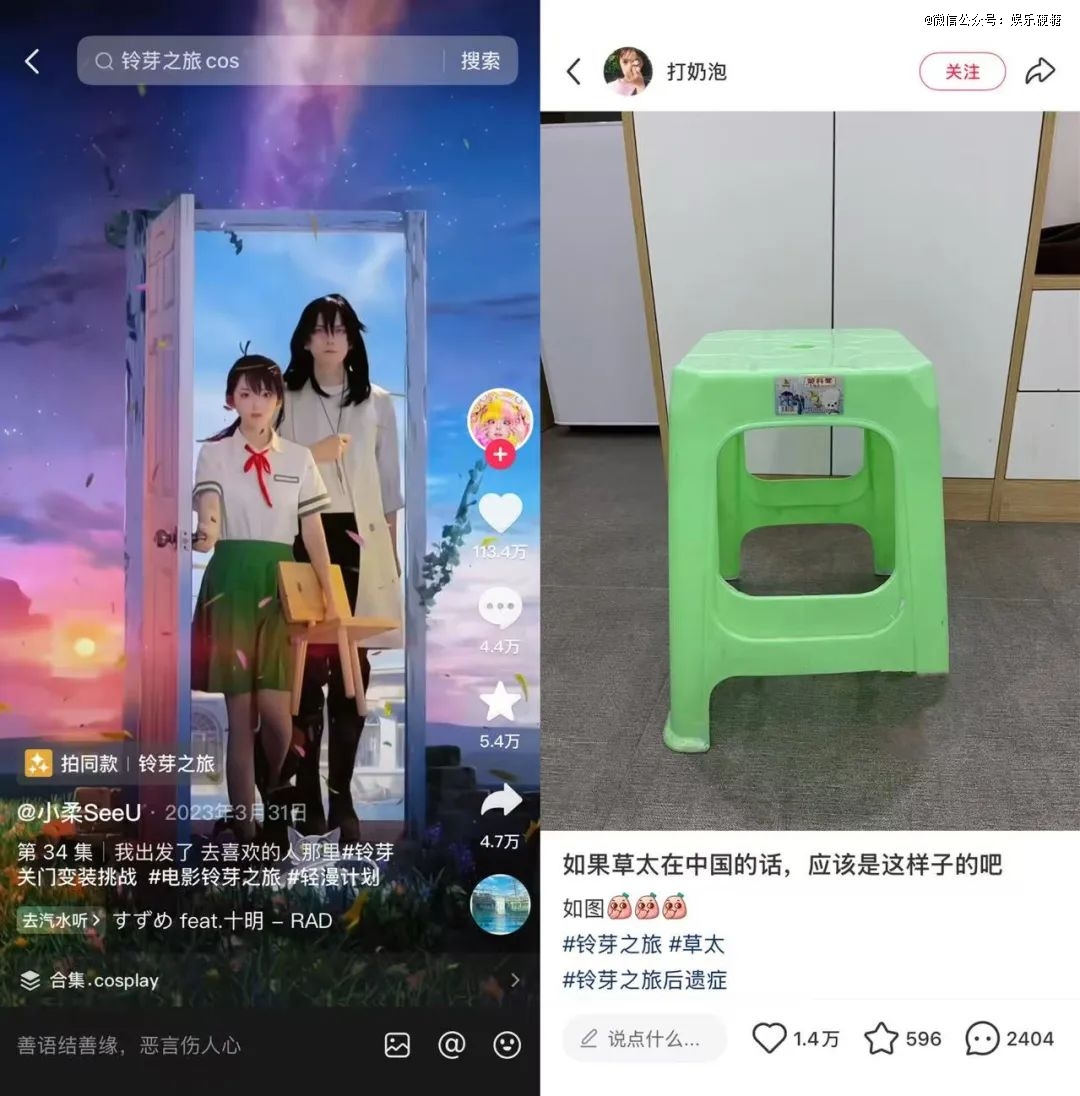 虽然这些梗不一定适合咱们年轻人的口味,但玩梗式病毒营销的思路是对的。我们也有适合国情的玩梗潮,比如路画2023年做《铃芽之旅》宣发,很多网友玩“门”与“椅子”的梗,是有帮助影片突破圈层,而且适用于图文与视频多平台传播。