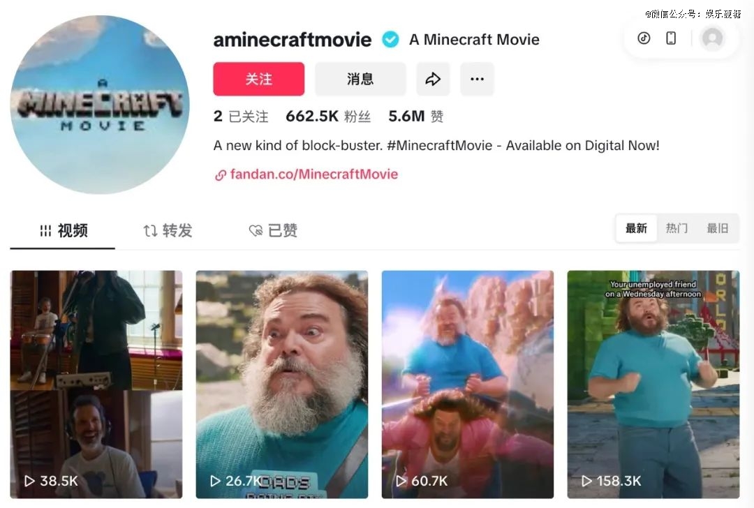 《我的世界大电影》TikTok官方账号吸引了66万粉丝,560多万点赞。与国内官方账号比起来,点赞数还差一些,但转化率却高很多。而且从两个账号的内容看,国外账号的素材明显比国内多,占一个先天优势。不过,随着他们在自家门口尝到短视频营销甜头,开放中国区素材指日可待,或许到时也能重振好莱坞电影的中国区票房。