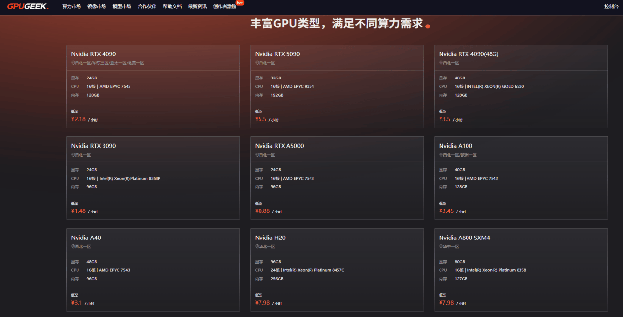 GpuGeek通过全栈式AI解决方案,深度整合生态算力资源,提供灵活、高效的GPU算力平台,帮助企业快速尝试和部署大模型。作为面向算法工程师的一站式AI Infra平台,GpuGeek提供了从基础算力到开发工具、模型部署的全方位支持。无论是RTX 5090、RTX 4090,还是A100等高端GPU资源,GpuGeek都能为企业提供灵活的按需计费模式,显著降低了AI应用的成本和部署门槛。