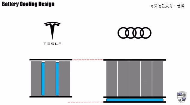 还有就是冷却系统,特斯拉采用的是在电池中间走冷却水道,而奥迪采用的是在电池包下面增加冷却装置。