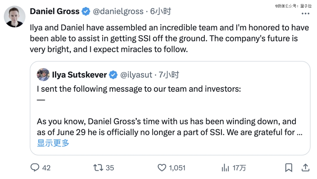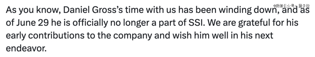 在被小扎撬走了联创后,Ilya本人刚刚对这件事做出了回应,证实Daniel Gross已经离开SSI。