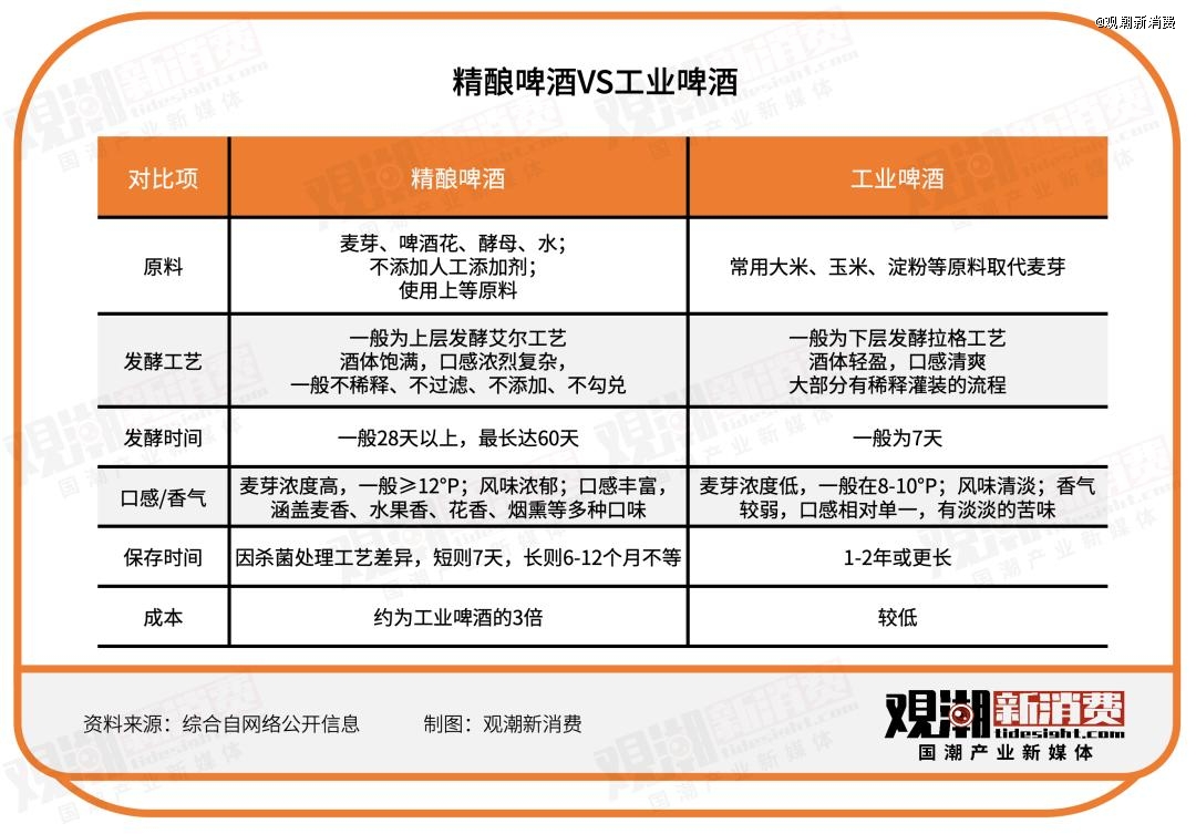 多维度对比可见,精酿啤酒在品质和口感上全方位碾压工业啤酒;不止如此,还暗合了健康无添加、新鲜短保、丰富口味等当下饮品的热门趋势。和“越来越淡”的普通啤酒相比,精酿成为更能满足啤酒脑袋的选择。