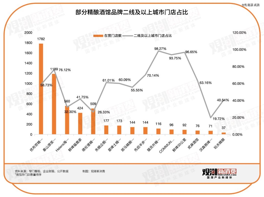 目前,精酿小酒馆这一业态仍主要活跃在二线及以上城市。猫员外精酿啤酒馆,位于二线及以上城市的门店占比高达98.27%;COMMUNE幻师、鲜啤30公里这一数据也超过了90%;在统计内的15个精酿酒馆品牌,这一数据的均值近60%。较为特殊的是主攻下沉市场的海伦司、德伦堡与汉森熊,这一数据在35%以下。