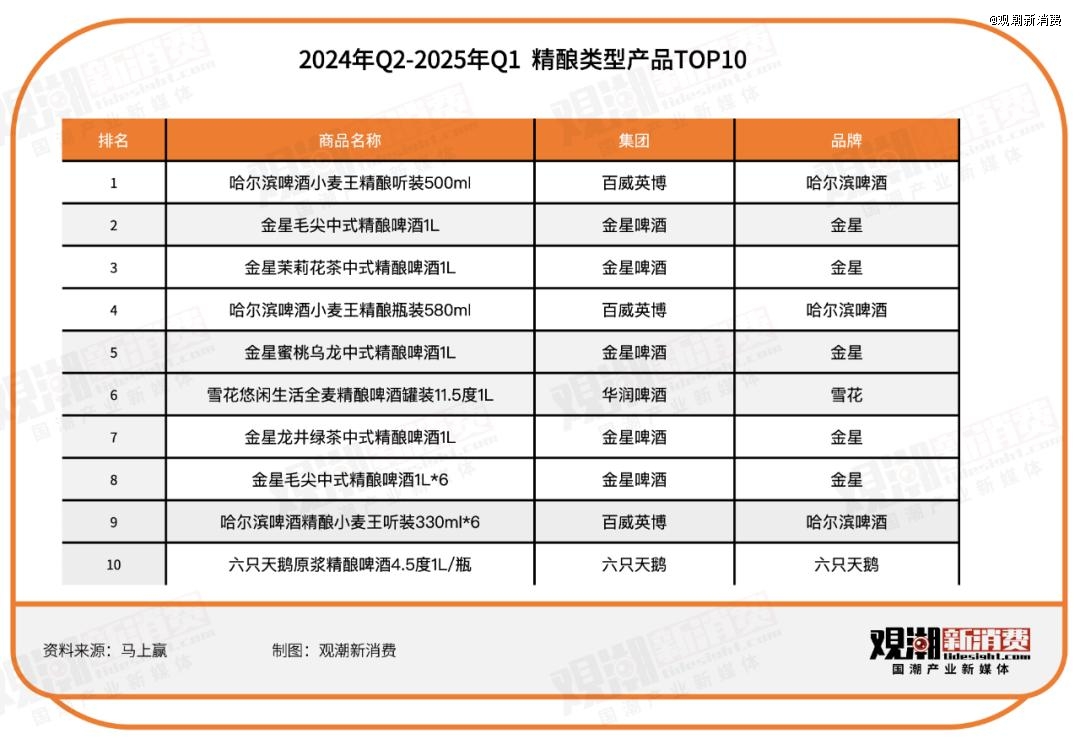 在马上赢统计的2024Q2-2025Q1精酿类型产品TOP10中,精酿新秀六只天鹅凭借「六只天鹅原浆精酿啤酒4.5度1L/瓶」入选,此前它就以10L装大单品在社交媒体出圈。其背后是拥有十余年进口啤酒供应链运营管理经验的成熟企业。此外,拥有重庆火锅精酿、江津青花椒精酿等多款高辨识度产品的重庆新锐精酿品牌渝津精酿背后,也站着重庆中德啤酒产业技术研究院。