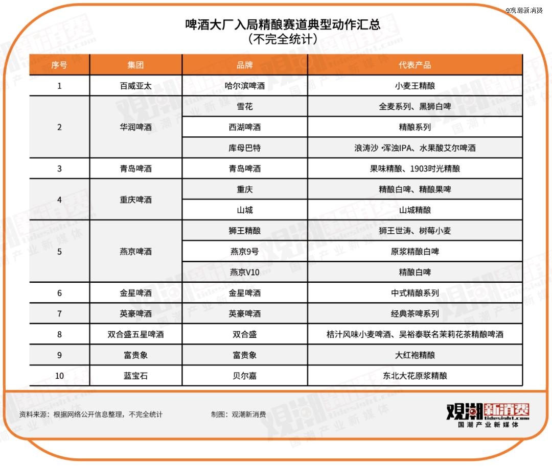 第二类选手是啤酒大厂,其中既有华润啤酒、青岛啤酒、哈尔滨啤酒等巨头,也有河南金星啤酒、山东锦泰山酒业、北京双合盛五星啤酒等老牌酒企。它们经过多年发展,在品牌力、市场占有率、渠道网络、供应链能力等方面积累了全方位的生态优势,等在精酿从小众迈向大众的必经之路上,成为这一进程的核心助力。