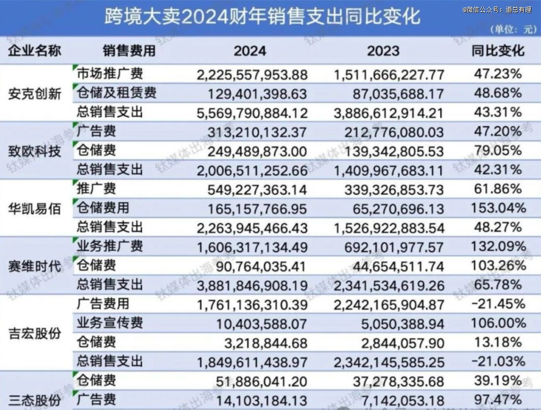 2024年,三态股份的广告费同比高出97.47%,赛维时代业务推广费同比更是上涨132.09%,赛维时代的仓储成本也同比升高了103.26%,华凯易佰的仓储费用2024年同比2023年暴涨153.04%。