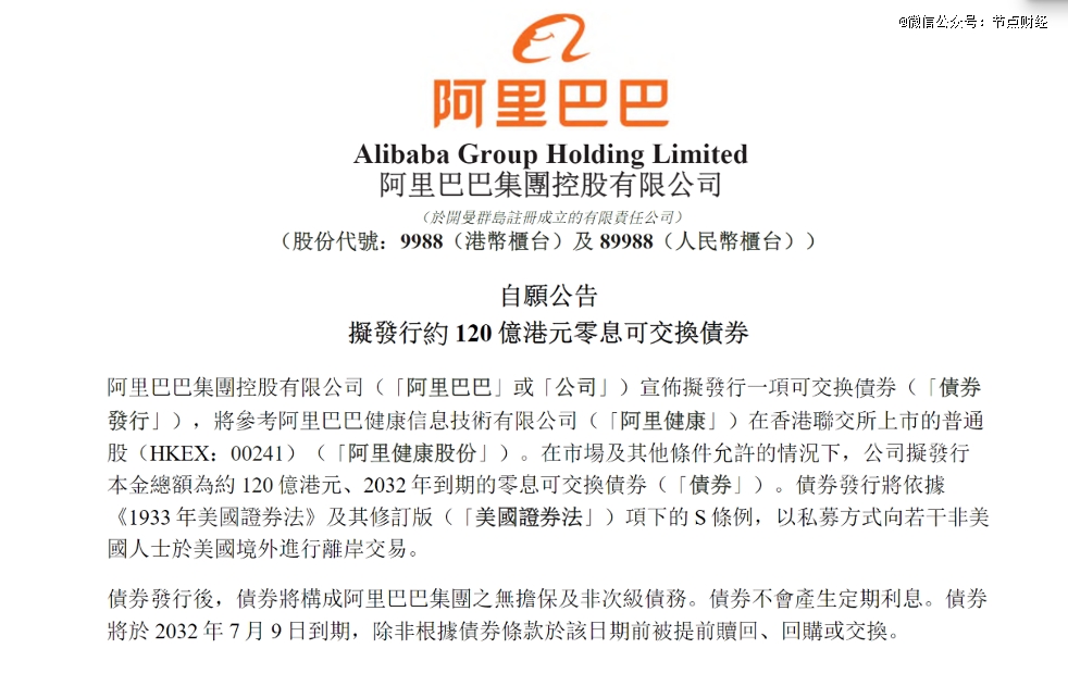 7月3日,阿里巴巴集团发布公告,计划发行本金总额约120亿港元、2032年到期的零息可交换债券。
