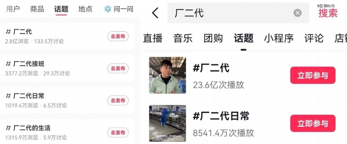如今在社交平台上,“厂二代”已成为一个热门标签。在小红书上,“厂二代”话题浏览达到2.8亿次,“厂二代接班”“厂二代日常”“厂二代的生活”等话题浏览量也都超过千万。抖音上,厂二代标签视频播放超过28亿次。