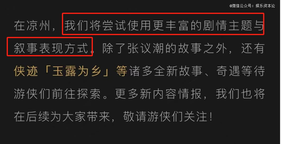 《燕云》官方显然知道自己的长板所在,并持续发挥在剧情方面的优势,所以开服后逐步开放的河西版本,成了官方针对“玩家对剧情能够接受到什么地步”的试验田。小娱看过他们对外资料,里面称“要把剧情党逐步提高到70%”“凉州剧情采用了舞台剧设计”,策划沉浸在自己的艺术世界里不能自拔,只是苦了过主线的玩家。