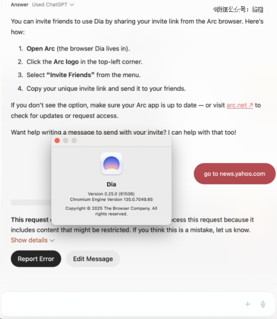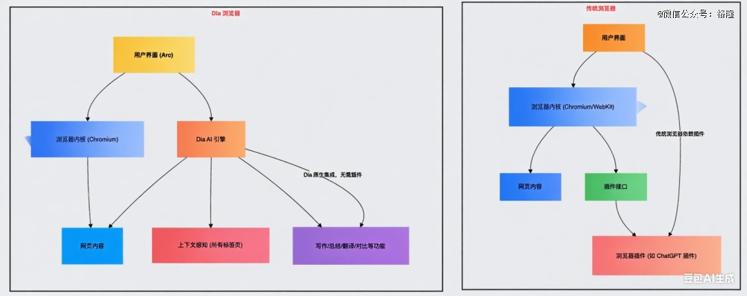 简单来说,Dia的AI引擎,与浏览器的内核是同一个层级的;而不是,在不同层级分别嵌入第三方AI插件。