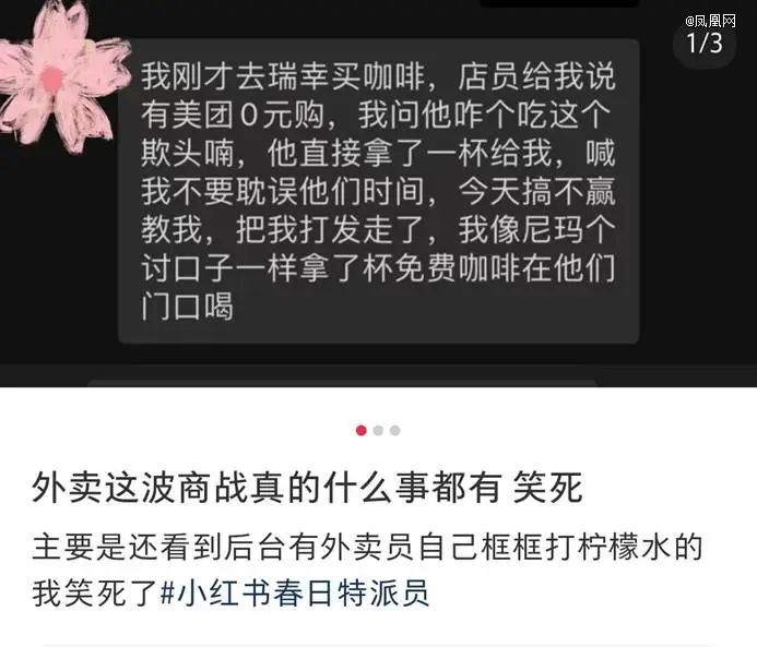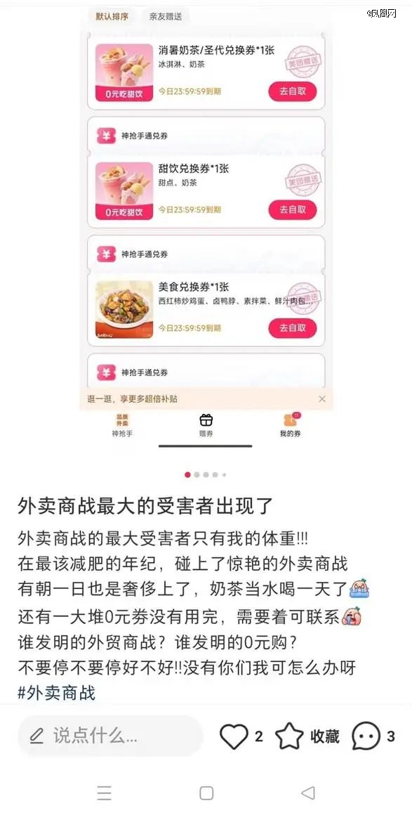 凤凰网《风暴眼》注意到,各类优惠活动的力度不断加码,竞争愈发激烈。满28元减18.8元、满20元减10元的福利还在刷屏,有平台甚至直接甩出“0元兑换券”的王炸。