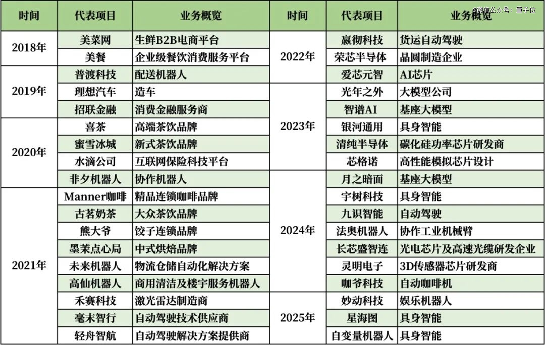 押注前沿科技的趋势则从2023年延续至今,这两年来的代表性被投项目,都来自AI、具身智能、半导体等领域,消费项目的比例断崖式减少。