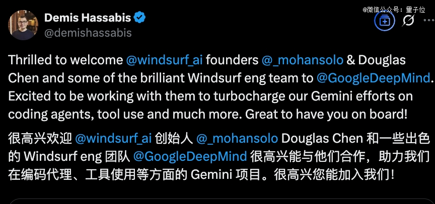 推文中透露,此番Windsurf团队加入谷歌,将参与到Gemini项目之中,负责Google DeepMind的编程Agent开发。