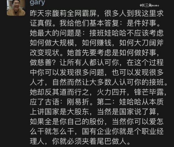 其实去年宗泽后有过一个朋友圈,对于今天的宗馥莉来说,依旧有效。