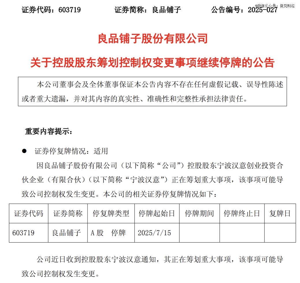 7月中旬,“高端零食第 一股”良品铺子发布公告称,公司近日收到控股股东宁波汉意创业投资合伙企业(有限合伙)(简称“宁波汉意”)通知,其正在筹划重大事项,该事项可能导致公司控制权发生变更。