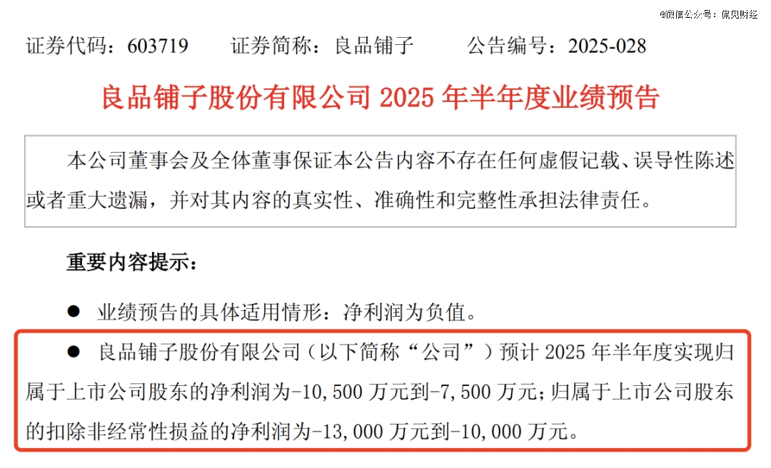 7月15日,良品铺子发布了2025年,中期业绩预告,预告显示,良品铺子上半年预计实现净利润为-1.05亿元到-0.75亿元(未经审计),扣非净利润分别为-1.30亿元到-1.00亿元。