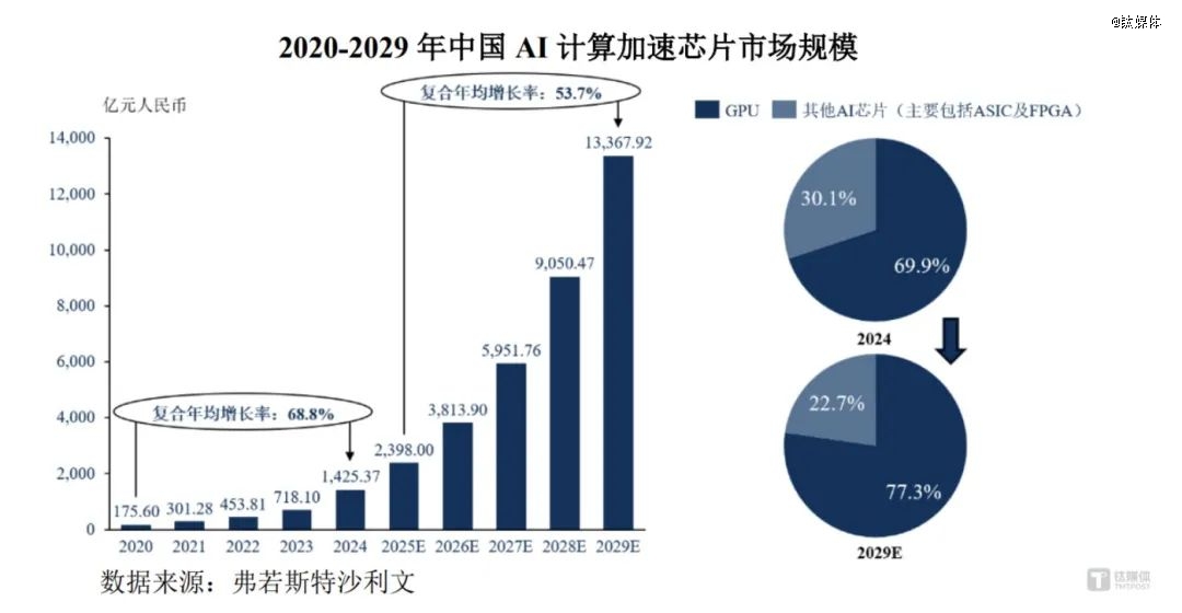 但与此同时,从数据来看,当前国内GPU芯片的市场占比69.9%,而其他AI芯片占比为30.1%。相对于弗若斯特沙利文给出未来22.7%的比例预期,IDC却认为,预计到2028年,中国加速计算服务器市场规模将超过550亿美元,非GPU架构服务器市场占比将迎来快速增长。
