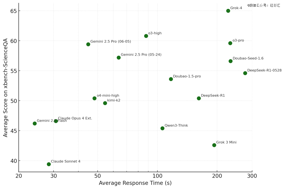 下图的横轴为平均响应时间,纵轴为xbench-ScienceQA平均分。