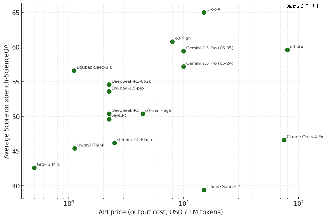 下图的横轴为API输出价格(USD/百万tokens),纵轴为xbench-ScienceQA平均分。
