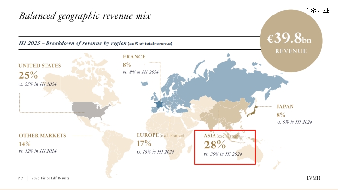 更为严峻的是,LVMH最新财报中的区域数据透露出结构性危机——集团第 一大市场、曾经销售贡献占比达三成的亚洲市场(除日本外)的份额进一步萎缩,2025H1份额下降至28%。而日本市场在第二季度因汇率波动导致游客消费崩塌,有机营收骤降15%。