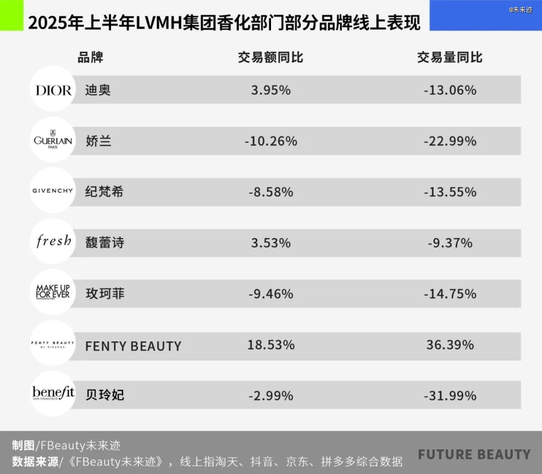 《FBeauty未来迹》获取的2025年上半年线上数据显示,LVMH旗下的美妆品牌中迪奥和馥蕾诗的交易额虽有所增长,但交易量却出现大幅下滑。这实际上印证了财报中“选择性零售策略(selective retail approach)”的本质——通过涨价策略维持高端形象,但客群基础却持续流失。