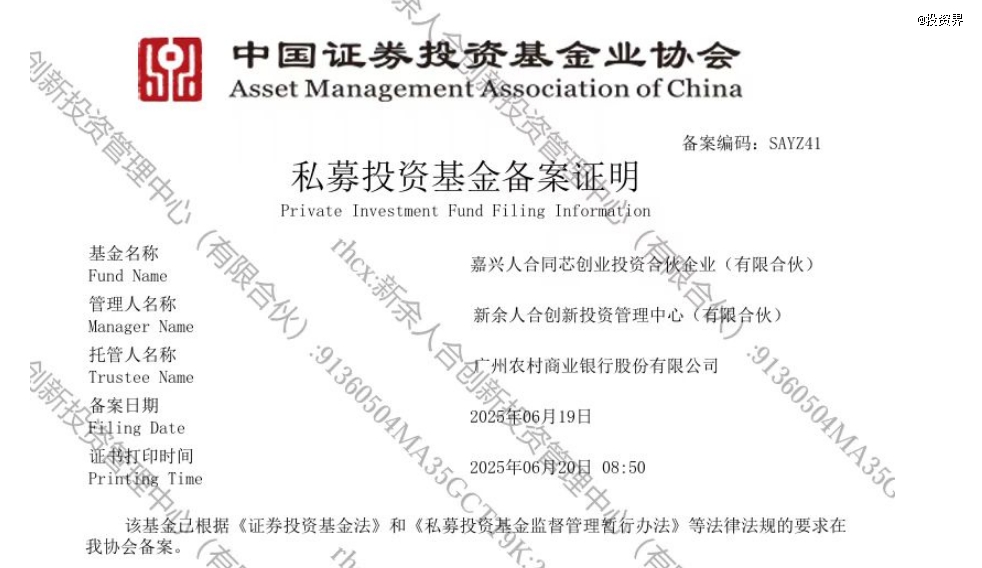 投资界(ID:pedaily2012)7月29日消息,近日,人合资本旗下第21支私募股权投资基金——人合同芯完成募集,并通过基金业协会备案。