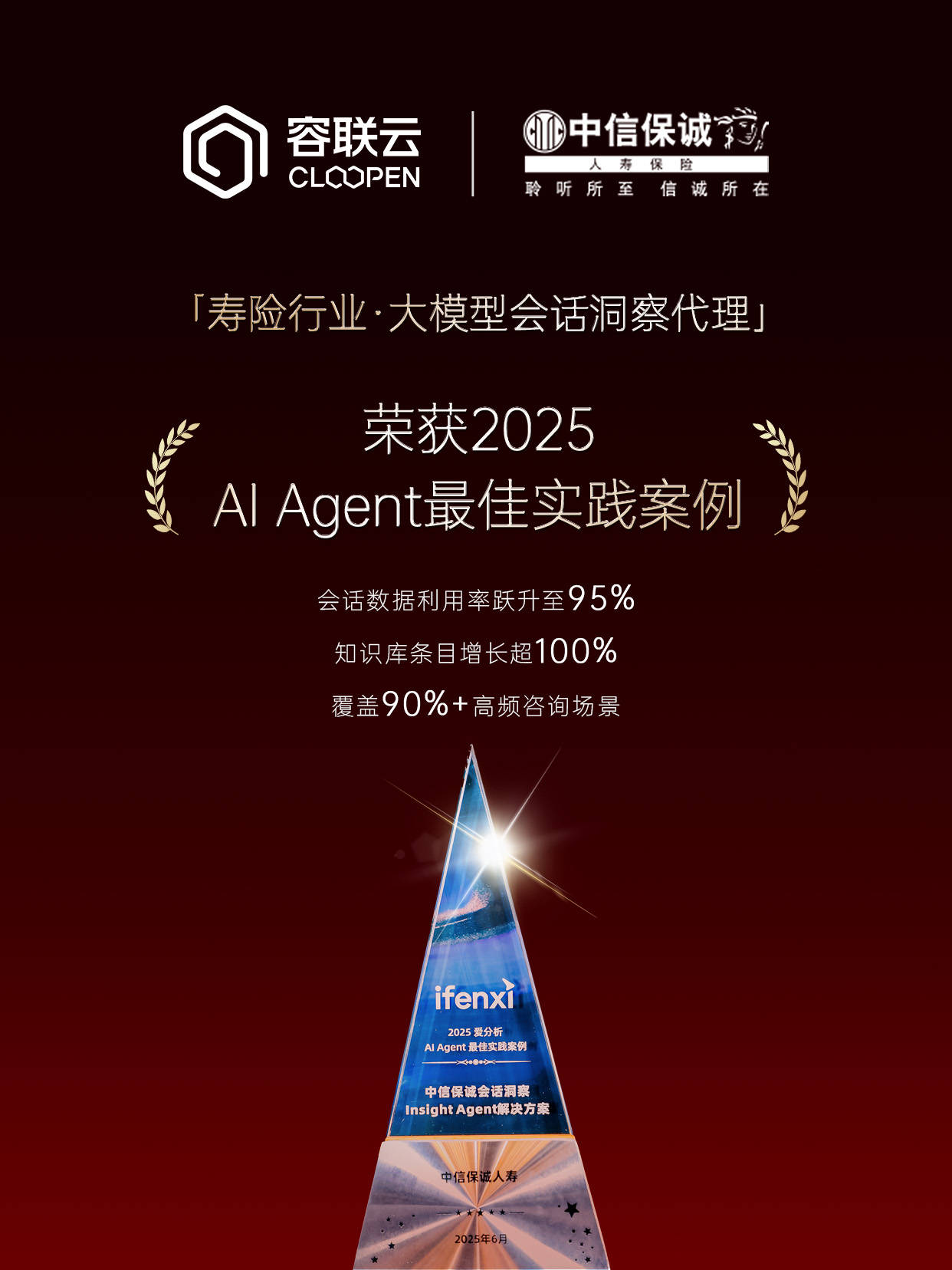 近日,容联云与中信保诚人寿打造的“大模型会话洞察 Insight Agent 解决方案”,成功斩获了在行业内*影响力的知名咨询机构爱分析所设立的 「2025 AI Agent 最 佳实践案例」奖项,这一荣誉充分彰显了双方在金融场景下推动 AI Agent 落地应用的标杆实践已获得行业高度认可与权威肯定,具有广泛的示范意义与借鉴价值。
