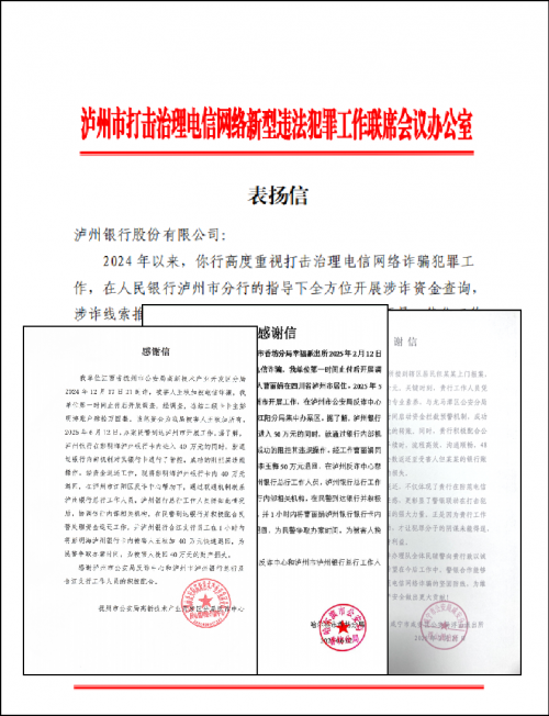 “白警官,有几名外省男子分散在我们的几个网点要大额取现,账户我们已经管控了,麻烦……”、“余警官,有个客户在我们网点要取现75万元定期去投资养老项目,定期还有1个月就到期了,还是坚持要取,劝都劝不住,需要你们协助……”、“@所有人,请辖内银行如有取现9万元左右的,尽快与反诈中心联系,该客户极大可能为潜在受害人”。这是泸州银行与泸州市公安局反诈中心建立“线索直报通道”后信息共享与协作的日常,确保了能够及时发现并处置异常行为。泸州银行2024年报送的100余条线索均直达市反诈中心,协助破获“海南省团伙流窜泸州特大诈骗案”等案件,抓获犯罪嫌疑人8名,并积极协助公安机关返还涉案资金300余万元,获得省、市两级公安机关的表扬。“没想到被骗的50万元还能一分不少的退回来,真的感谢你们泸州银行,我要到泸州来亲自感谢你们”,远在黑龙江的受害人李某专门打电话激动地向我行表示感激。