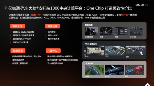 硬件方面,亿咖通科技的“安托拉”系列舱驾融合方案,以7纳米“龍鹰一号”车规级SoC为核心,可实现数字仪表智慧中控等主流智能座舱功能、L2级的辅助驾驶HWA、ALC和自动泊车辅助(APA、RPA),目前已实现单芯片“舱行泊一体”功能稳定运行并完成实车测试;并遵循ISO 26262开发流程,满足ASIL B功能安全要求,在实现高安全性的同时,通过硬件一体化、舱驾算力按需分配,实现整体方案的降本增效,具有极高的性价比。
