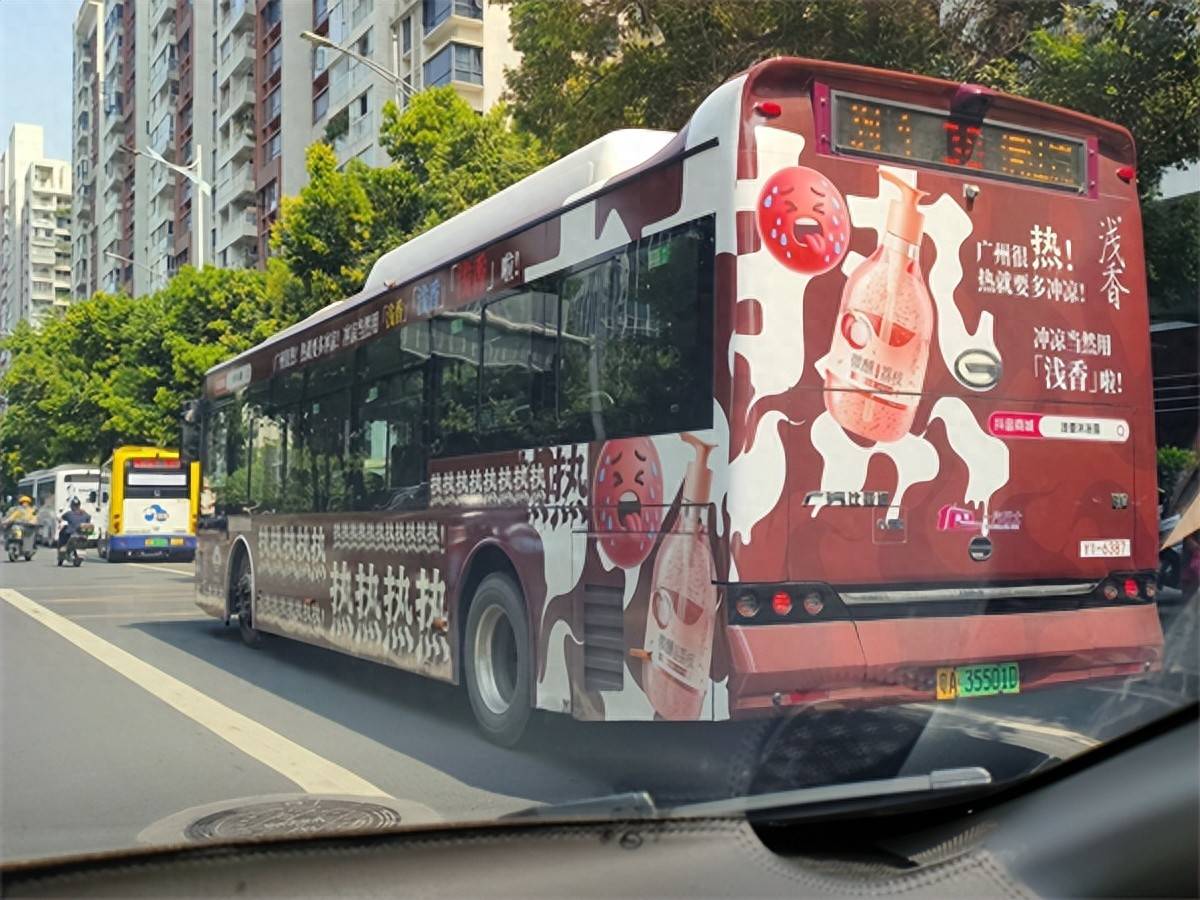 更妙的是浅香选择了公交车作为传播的载体。在广东生活过的人都有过在公交站等车被太阳暴晒的经历,都能秒懂那种热到怀疑人生的感受。在这个日常通勤场景,这句广告语,更像是一次对广东人集体心理的精准狙击。浅香把这种共同体验放大,然后实实在在地告诉你:"天热了,多冲凉,冲凉就用我们家的。"