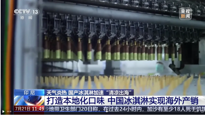 近日,全球多地持续高温,这股“热浪”中,中国冰淇淋品牌正加速出海,为海外消费者送去“清凉”。7月21日,央视新闻频道以《天气炎热 国产冰淇淋加速“清凉出海”》为题,报道了伊利冰淇淋在印尼与沙特市场的产销情况。从口味调整到包装设计,从冷链布局到销售渠道,伊利用一支支冰淇淋在中东与东南亚成功破冰。