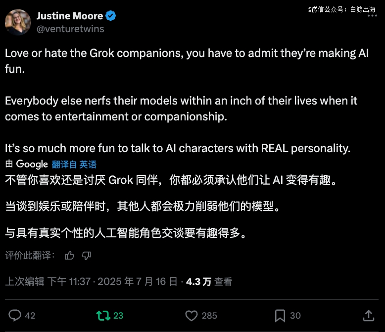 Ani 来自马斯克领导的 Grok。在陪伴模式下,Ani 可以沉浸式地同用户调情,后续还会随着好感度的上升开启 NSFW 模式以及换装等玩法。a16z 的投资人 Justine Moore 评价说,涉及到娱乐/陪伴,当其他 AI(ChatGPT、Claude)都被削弱得只剩工具感,Grok 却让这一切变得有趣了起来。