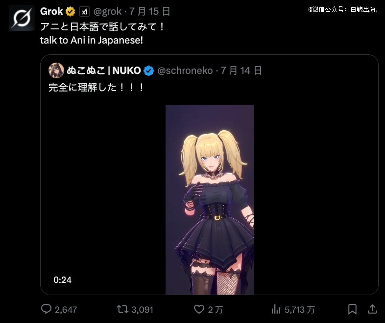 Grok 官方账号发布的*一条 Ani 相关贴文是面向
