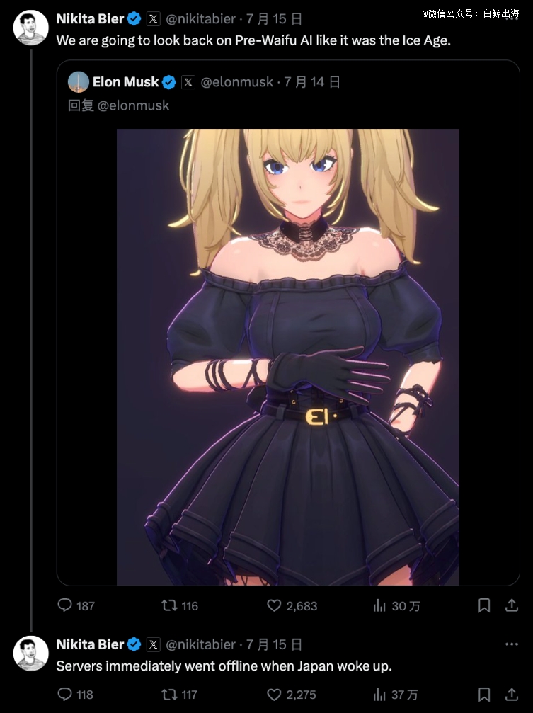 而现任 X 产品负责人的 Nikita Bier 也曾在转发 Ani 上线的推文时调侃,“一旦日本醒来,服务器可能会迅速掉线。”看似一句玩笑,却也透露出他们对日本用户情绪反应的高度预期。