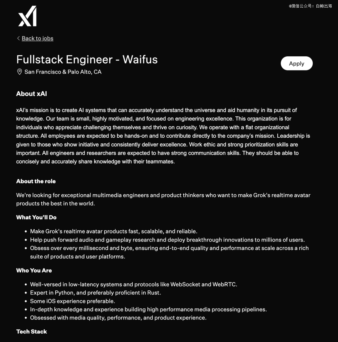 很难说「Grok」团队对于 Ani 在日本市场的走红完全没有预见。Ani 在外形上具备充分二次元元素,有网友指出 Ani 的造型灵感很可能来自日漫《死亡笔记》中的弥海砂,马斯克本人就曾在 2021 年公开推荐过这部二次元名作。而 xAI 近期发布一则招聘显示,团队内部已经将御宅文化中代表理想虚拟伴侣的“Waifu”作为专门的产品方向,并为此招聘全栈工程师。