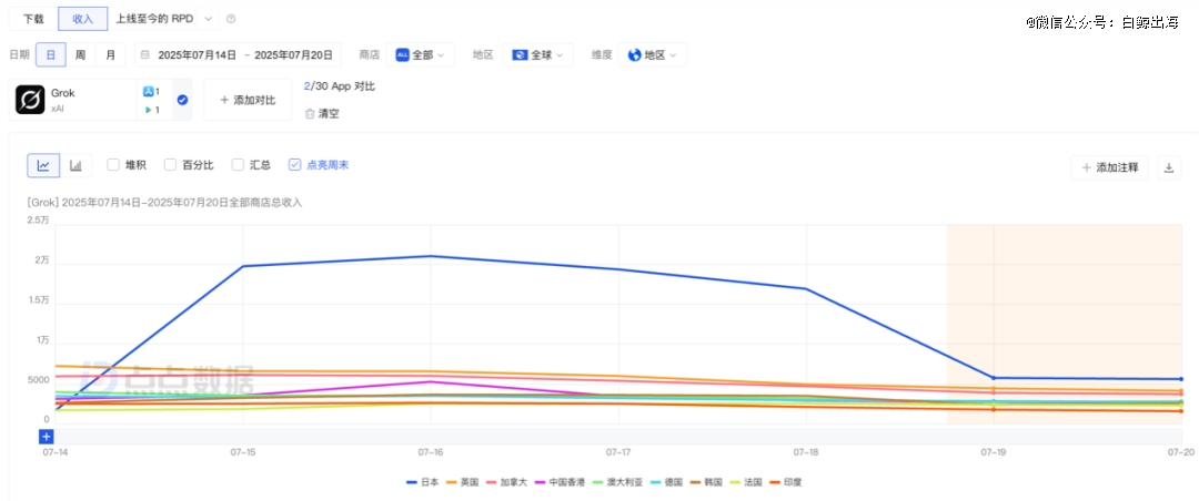 7 月 14 日 -7 月 20 日「Grok」内购收入国家分布