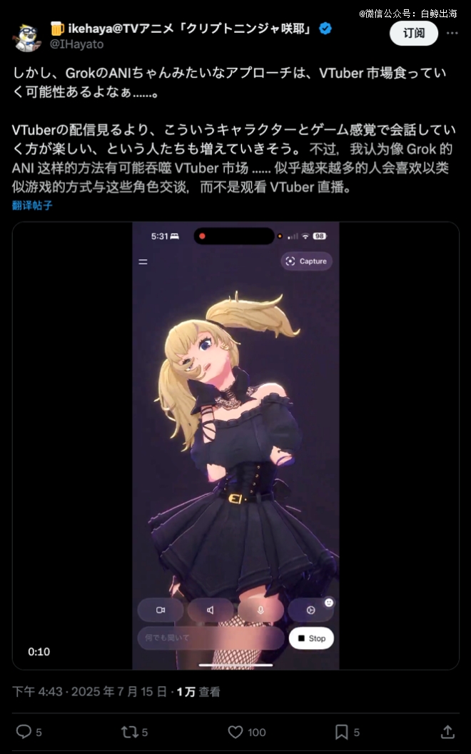 在 C.ai 等现象级 AI 社交产品尚未攻下日本市场的背景下,Ani 的出现却迅速引发大量本地用户讨论,一定程度上是因为她唤起了一个日本用户早已熟悉的文化现象,VTuber,但却以另一种更私密的方式给予用户 Waifu 向体验。