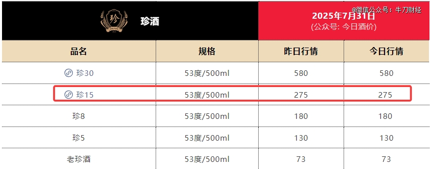 珍十五、珍三十出现了严重的价格倒挂。例如,珍十五建议零售价在500元以上,但“今日酒价”公众号显示的价格仅为275元。