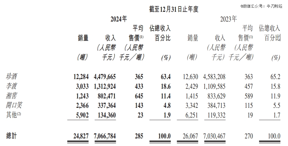 财报显示,2024年,珍酒的高端产品营收17.09亿元,同比下滑10.82%,占总营收比例降至24.2%。