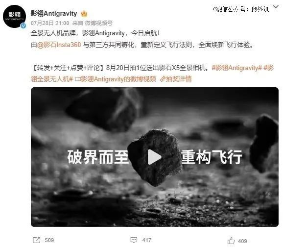 7月28日,影石创新正式官宣亮相消费级无人机品牌"影翎Antigravity",并计划在8月发布全球*"全景无人机"。