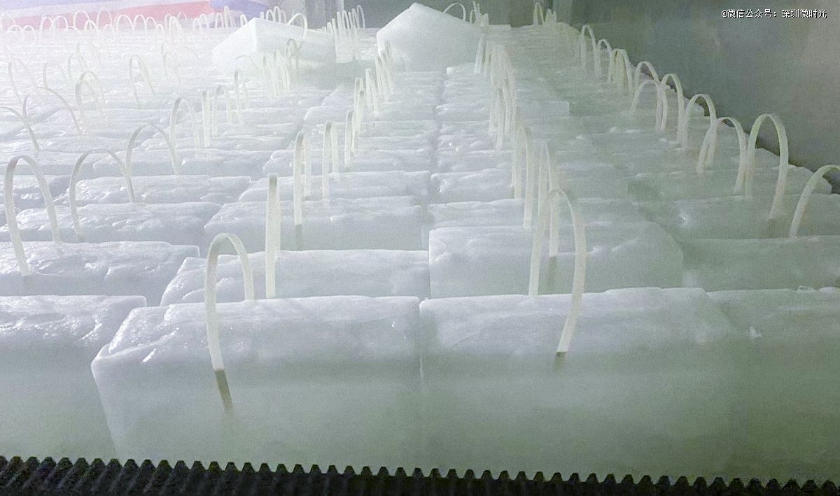 深雪冰厂里有8、9个工人,制冰厂房内气温零下15度,200kg/块的工业用冰的冷冻时间是9小时左右,20kg/块工业用冰冷冻时长大约6小时,食用冰的冷冻时长大概5个小时。